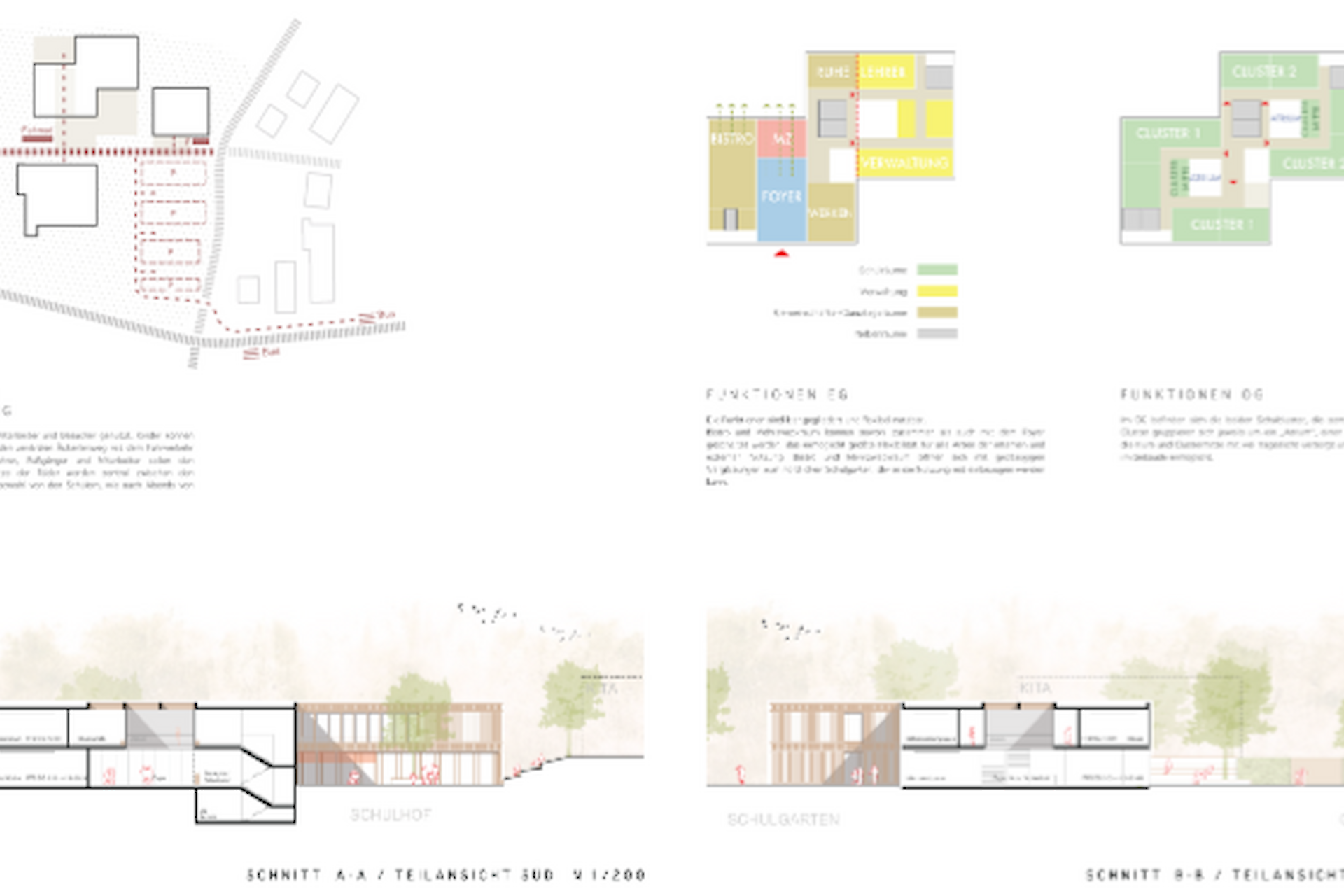 Außenräume. Am Baukörper der Schule ist die Struktur der beiden Cluster klar ablesbar.